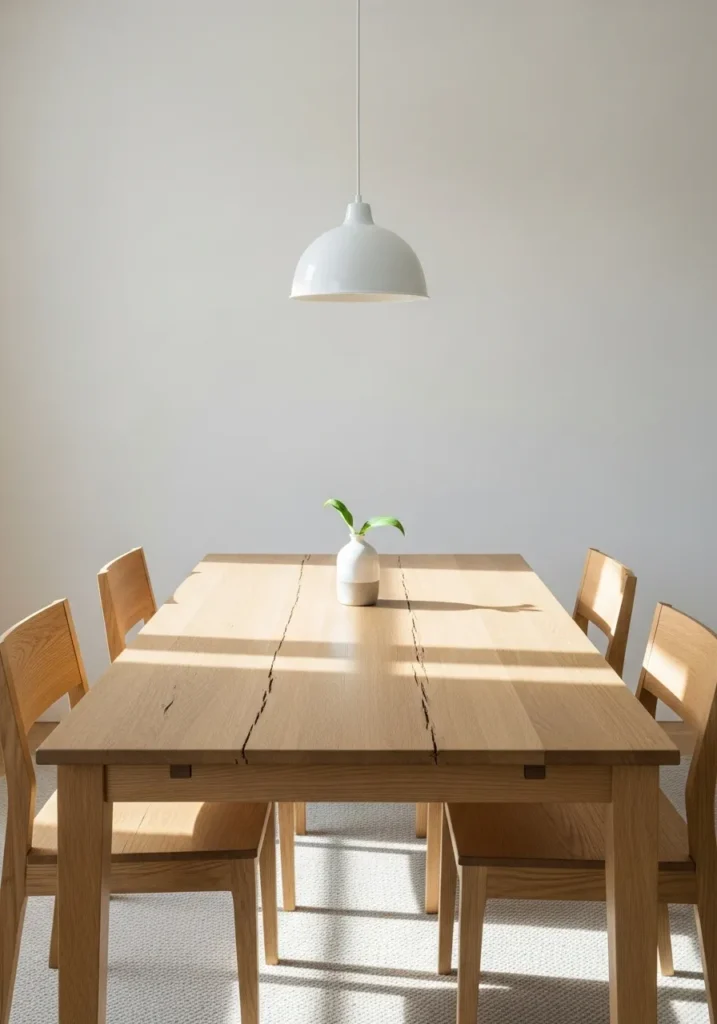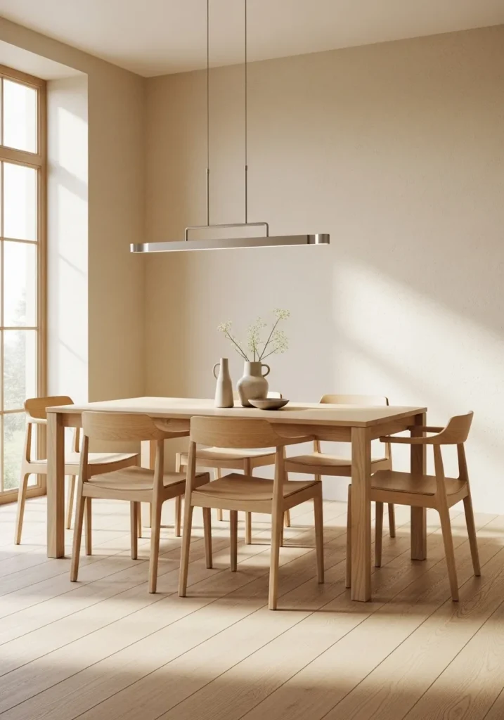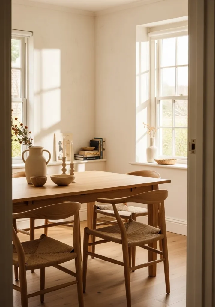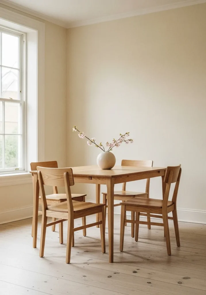 This dining room uses light cream walls paired with simple Scandinavian style wood furniture. The clean silhouettes and pale finishes keep the room feeling spacious and bright. Natural light highlights the warmth of the wood without making the space feel heavy. Everything feels intentional but relaxed, which makes the room very easy to enjoy.