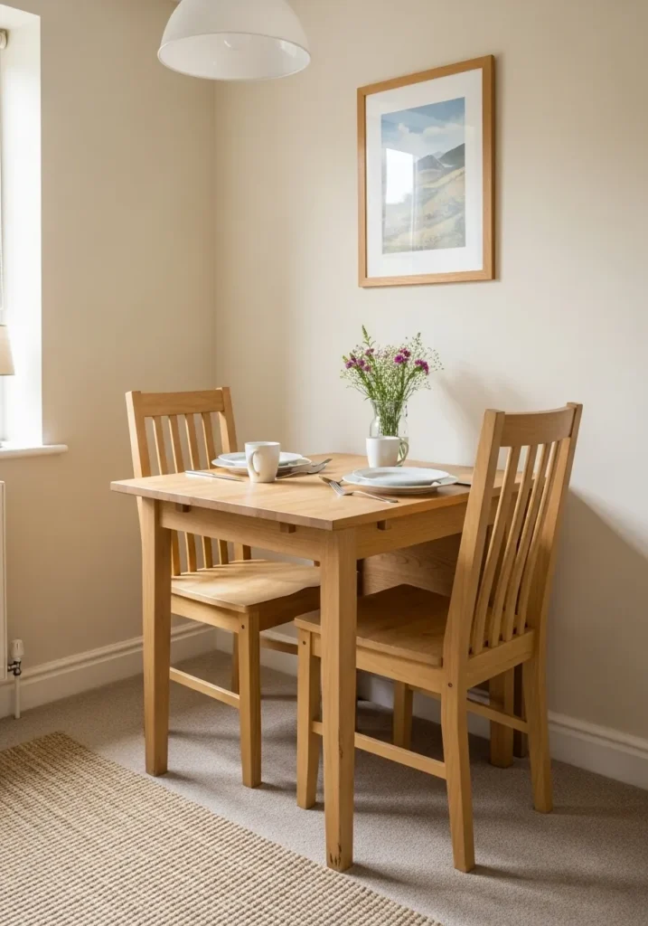 This dining room features soft neutral walls combined with light wood furniture in a smaller dining setup. The paint color keeps the space feeling bright while the furniture adds warmth and structure. Simple artwork and minimal decor keep the look fresh and approachable. Everything feels thoughtfully placed without feeling staged.