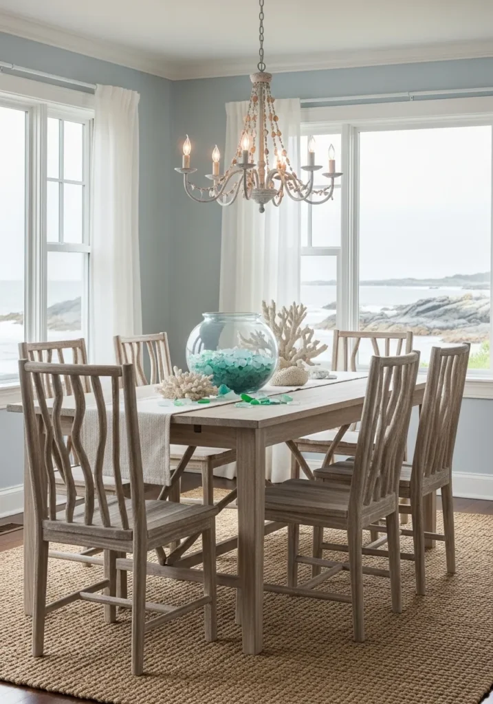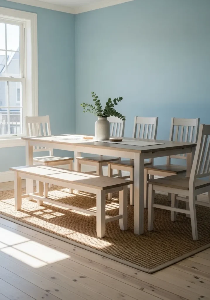 This dining room features soft airy blue walls paired with a light wood table and chairs that feel relaxed and welcoming. The paint color keeps the room feeling cool and open while natural light pours in through the window. Simple decor and clean lines let the color and furniture do the talking. Everything feels calm and uncluttered, with a very easy everyday vibe.