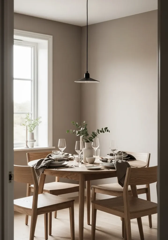 This dining room features warm greige walls that sit perfectly between beige and gray. Light wood furniture adds warmth and keeps the space feeling open. Natural light softens the wall color and highlights the clean lines of the table and chairs. The simple pendant light keeps the look modern and uncluttered.