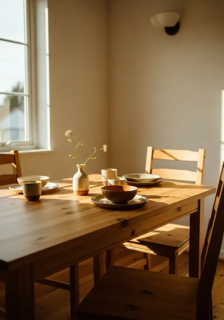 This dining room features warm sand colored walls that glow in natural sunlight. Light wood furniture enhances the cozy feel while still keeping the space open and uncluttered. Simple tableware and natural textures add to the relaxed atmosphere. The light coming in through the window makes everything feel golden and inviting.