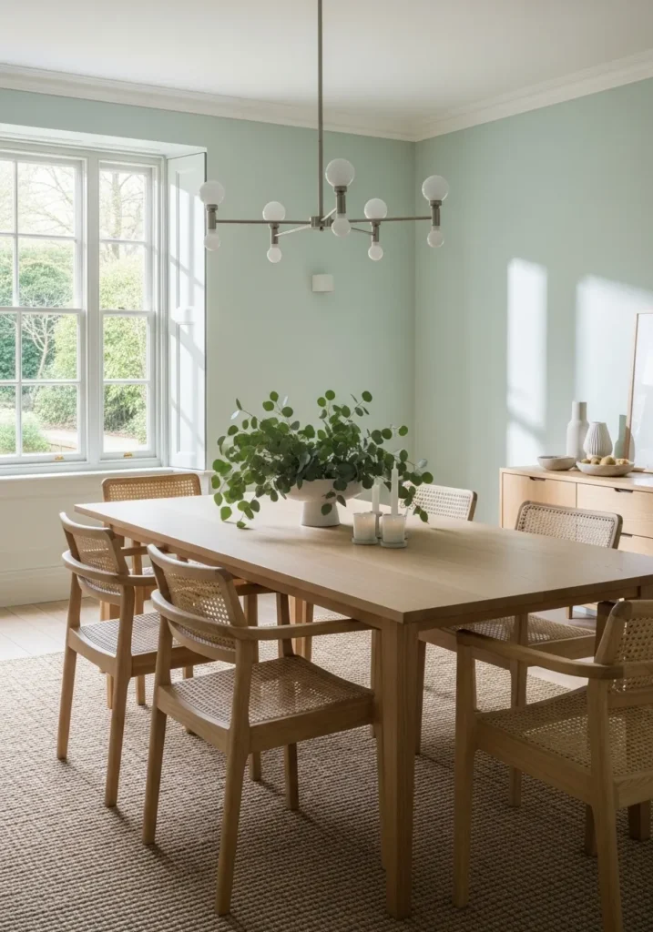 This dining room uses soft mint green walls paired with light wood furniture for a fresh and uplifting look. Large windows bring in plenty of daylight, making the color feel light and cheerful. Simple lighting and subtle greenery keep the room feeling natural and uncluttered. The overall space feels open calm and full of life.