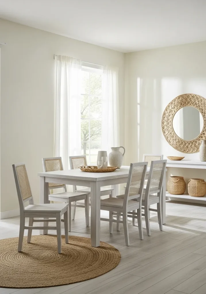 This dining room features soft cream walls that reflect natural light beautifully and keep the space feeling open. Light wood furniture pairs effortlessly with woven accents like the rug and wall decor, adding warmth without heaviness. The pale flooring and simple styling help everything feel calm and balanced. The overall look feels bright, relaxed, and very easy on the eyes.