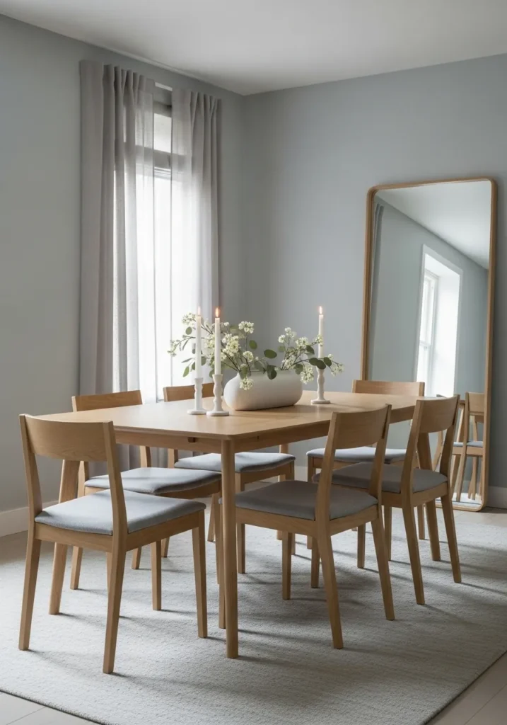 This dining room uses pale gray walls paired with a simple light wood dining table and chairs. The color palette is clean and understated, allowing the natural light to shine. A single pendant light and minimal decor keep the space feeling open and uncluttered. The room feels balanced and calm.