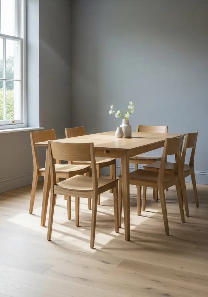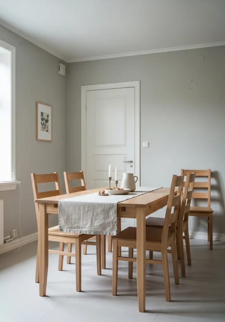 Here we see pale gray walls combined with classic light wood dining chairs and a matching table. The color palette is subtle and airy, letting the room breathe. Natural light reflects softly off the gray walls, keeping the space bright even on quieter days. Everything feels balanced and practical, with nothing overpowering the room.