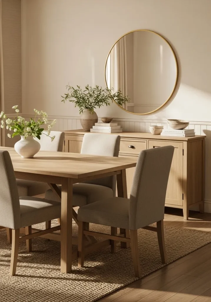 This dining room features creamy neutral walls that blend seamlessly with light wood furniture and soft textiles. The round mirror adds warmth and depth while reflecting light around the room. Subtle decor and natural materials keep the look cohesive and airy. The overall feel is cozy yet open, with a gentle elegance that feels very inviting.