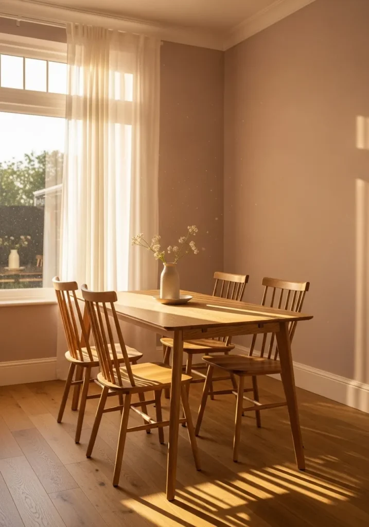 This dining room is painted in a warm blush toned neutral that glows in the sunlight. Light wood furniture keeps the space feeling fresh and uncluttered. Sheer curtains filter the light beautifully, creating soft shadows across the floor. The overall look feels warm airy and full of natural charm.