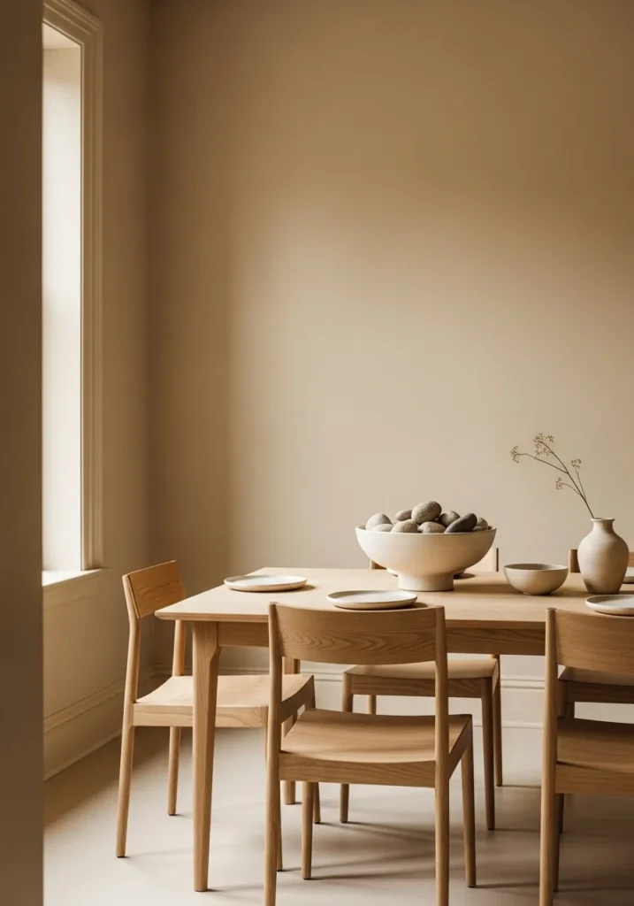 This dining room uses a warm beige paint color that pairs effortlessly with light wood furniture. The clean lines of the table and chairs keep the room feeling open and uncluttered. Soft natural light fills the space, creating a gentle glow on the walls and furniture. A simple pendant light and a small centerpiece add just enough detail without stealing attention.