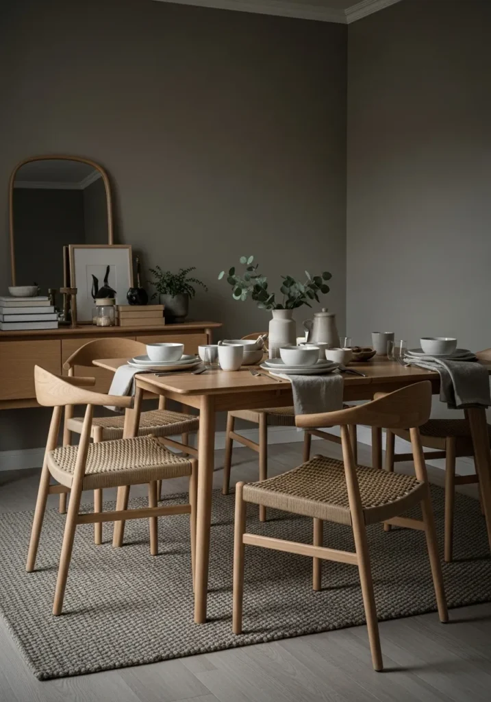 This dining room features muted gray walls paired with light wood furniture and woven textures. The darker wall color still feels airy thanks to the pale furniture and soft natural light. A simple rug and subtle greenery add warmth without clutter. The overall look feels grounded yet open.