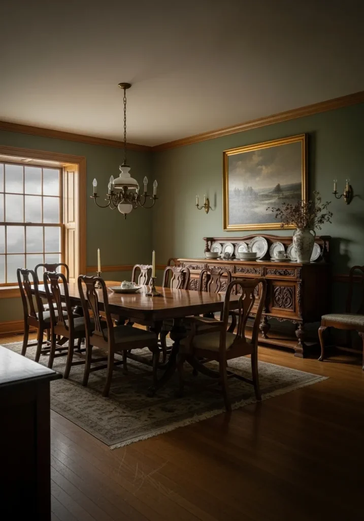 This dining room pairs a deep muted green wall color with rich oak trim that instantly grounds the space. The darker paint adds depth while the wood brings warmth and tradition. Framed artwork and a long dining table give the room a timeless feel. Natural light softens the darker tones and keeps everything from feeling heavy.