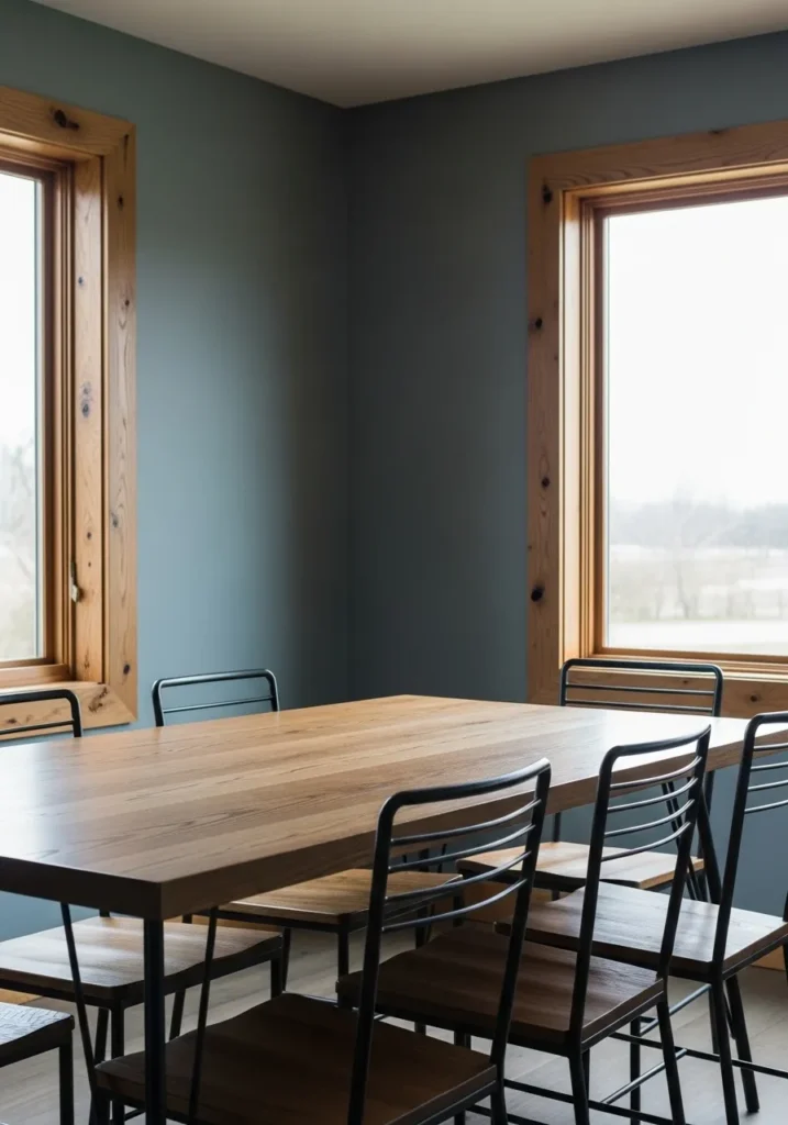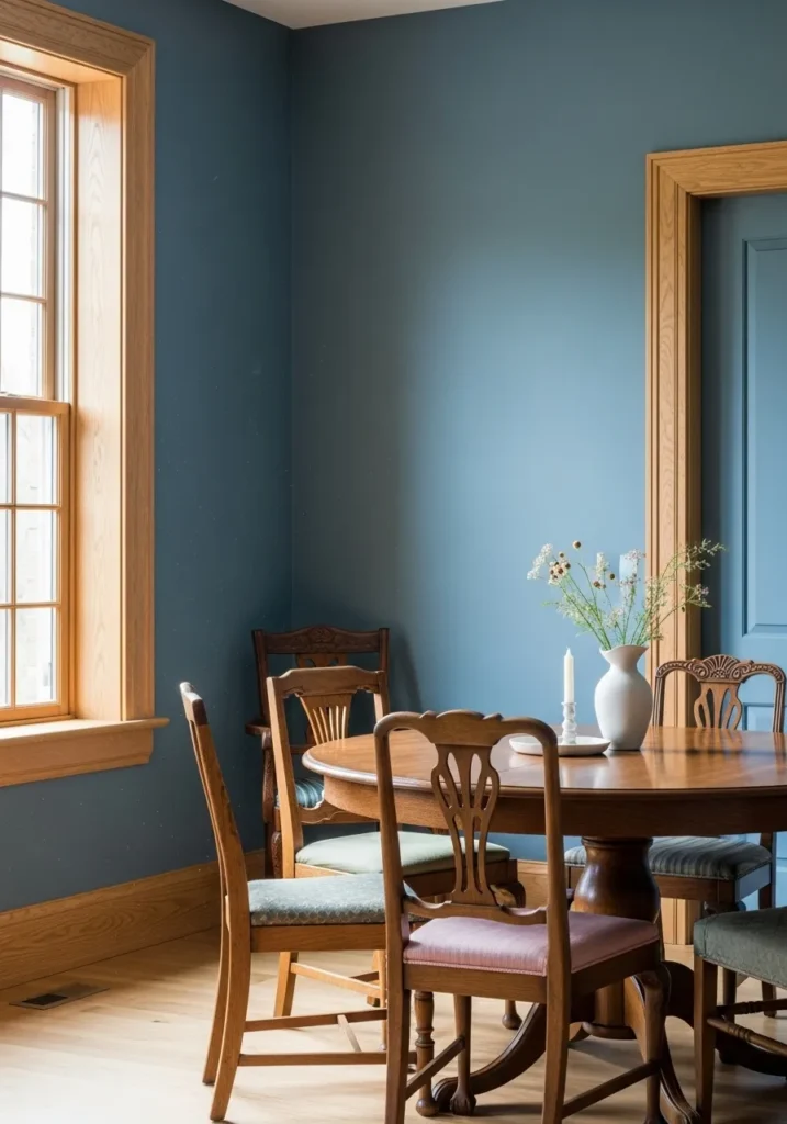 This dining room features a muted blue wall color paired with natural oak trim and a simple wood table. The deeper tone adds mood while the oak keeps everything grounded and warm. Clean lines and minimal decor give the room a modern but approachable feel. Large windows keep the darker color from feeling heavy.