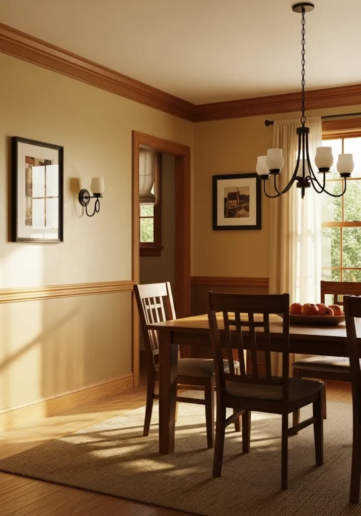 This dining room uses a soft tan wall color that pairs beautifully with traditional oak trim and chair rail. The warm tone creates a cozy backdrop for classic furniture and framed artwork. Sunlight adds a golden glow that enhances the wood tones throughout the room. Everything feels well balanced and familiar.