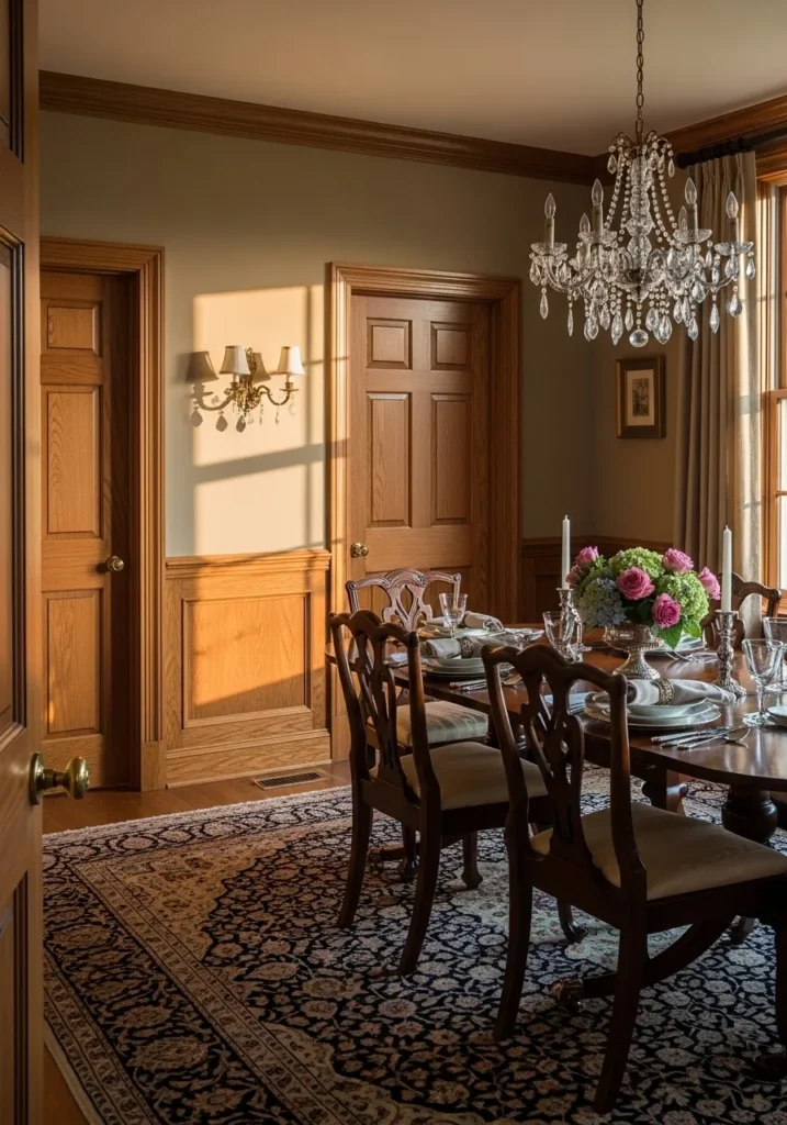 This dining room features light neutral walls paired with detailed oak trim and paneled doors. The trim adds texture and depth while the soft paint color keeps the room feeling bright. A chandelier and traditional dining set bring a touch of elegance. The patterned rug anchors the space and adds warmth.