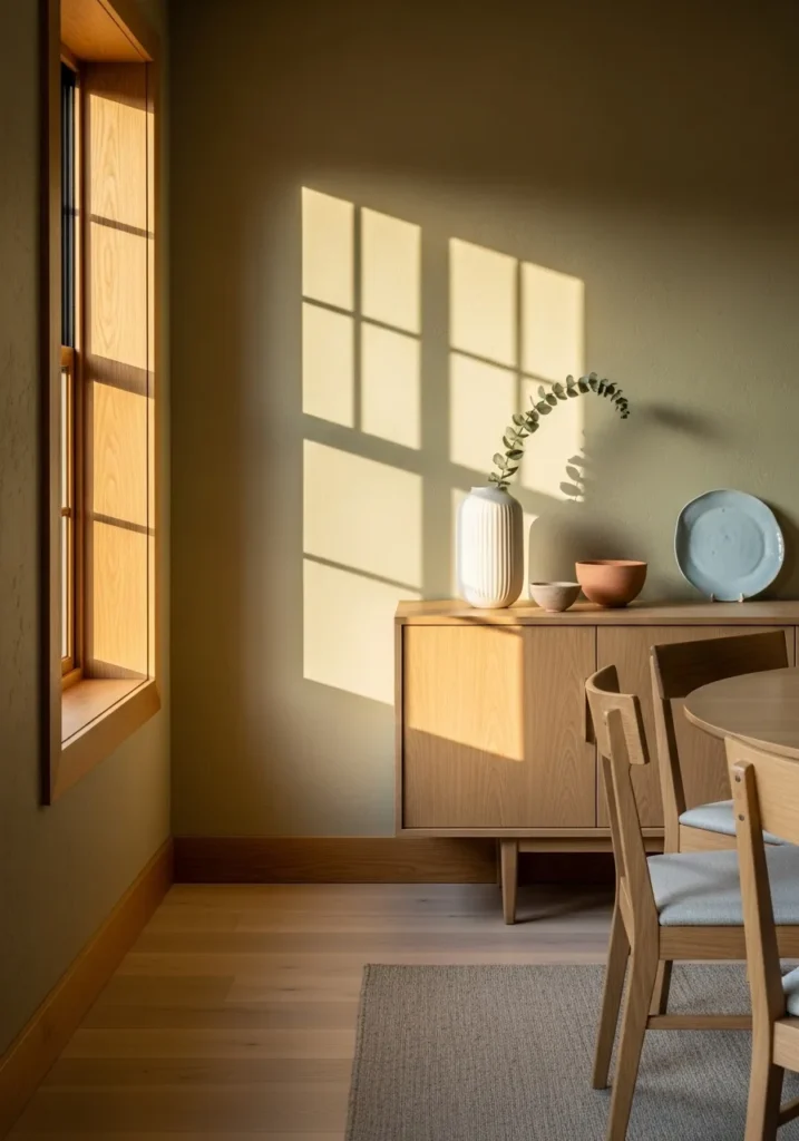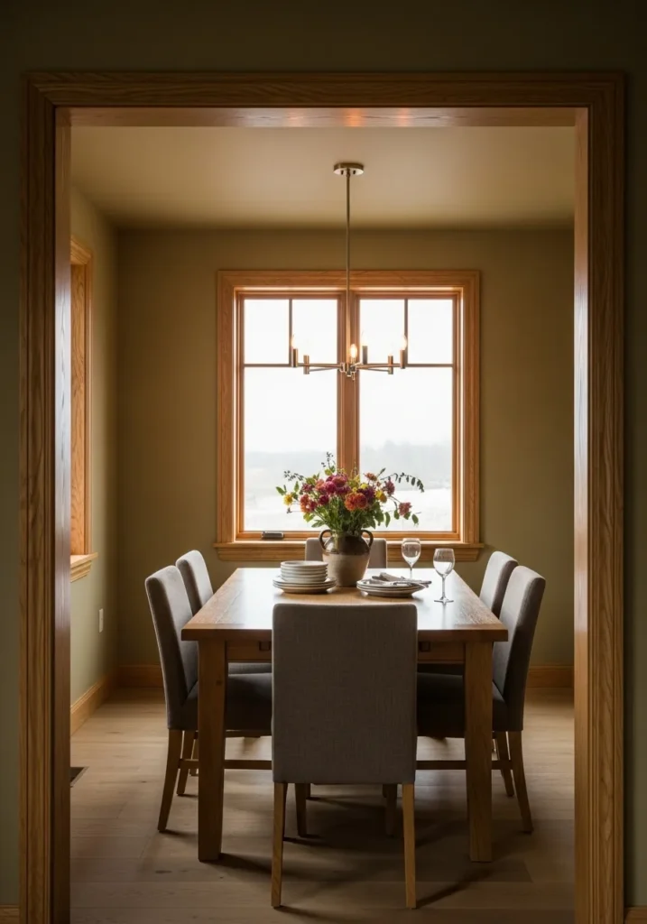This dining room uses a soft olive wall color that feels calm and slightly moody, perfectly framed by warm oak trim around the doorway and windows. The color adds depth without making the space feel dark. Natural light pulls everything together and highlights the wood tones in the table and floors. The overall look feels cozy and well grounded.