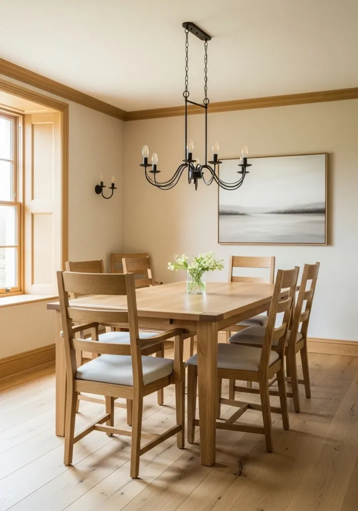This dining room uses soft cream walls that reflect light and enhance the warmth of the oak trim and flooring. The neutral backdrop makes the furniture feel cohesive and timeless. A simple chandelier adds charm without stealing attention. The room feels bright and comfortable.