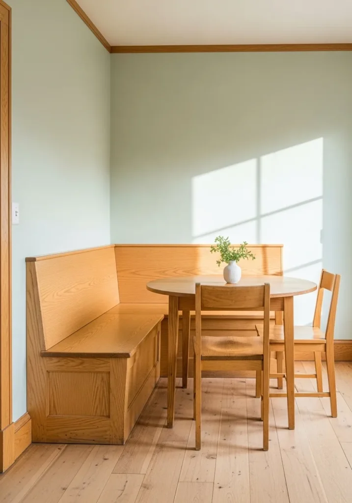Pale Green Dining Room With Cozy Oak Banquette