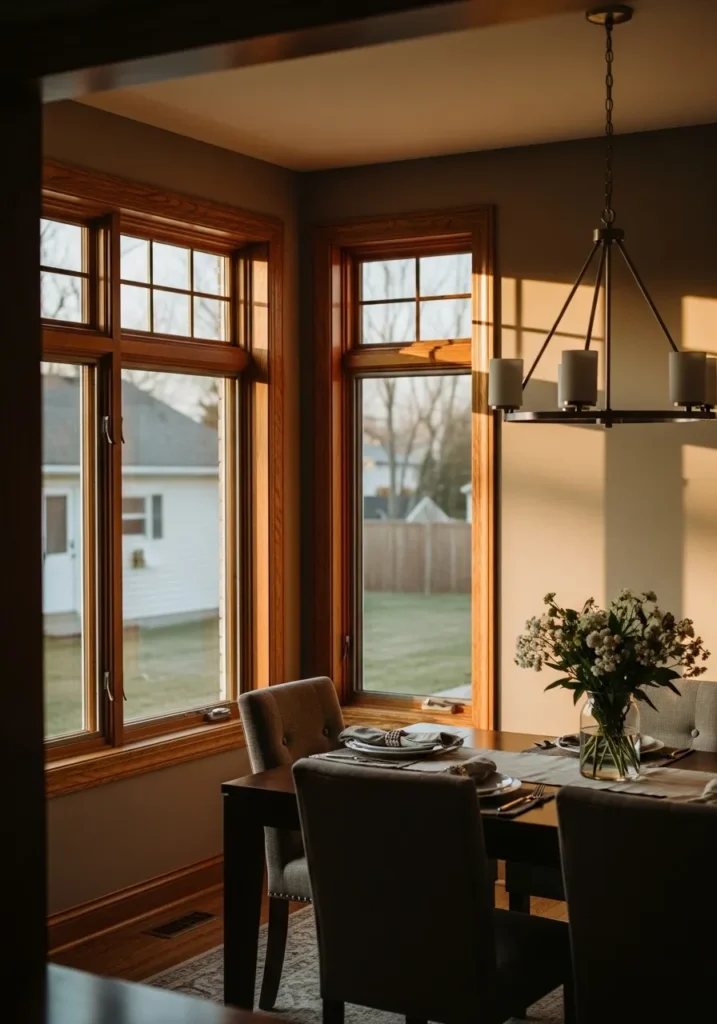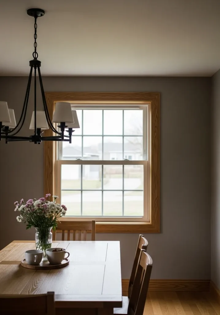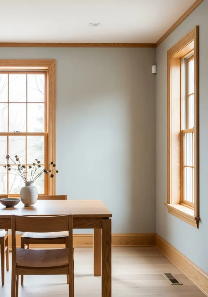This dining room keeps things simple with light gray walls that let the oak window trim stand out. The cool wall color creates contrast while the wood adds warmth and balance. Minimal furniture keeps the space uncluttered and bright. Natural light does most of the decorating here.