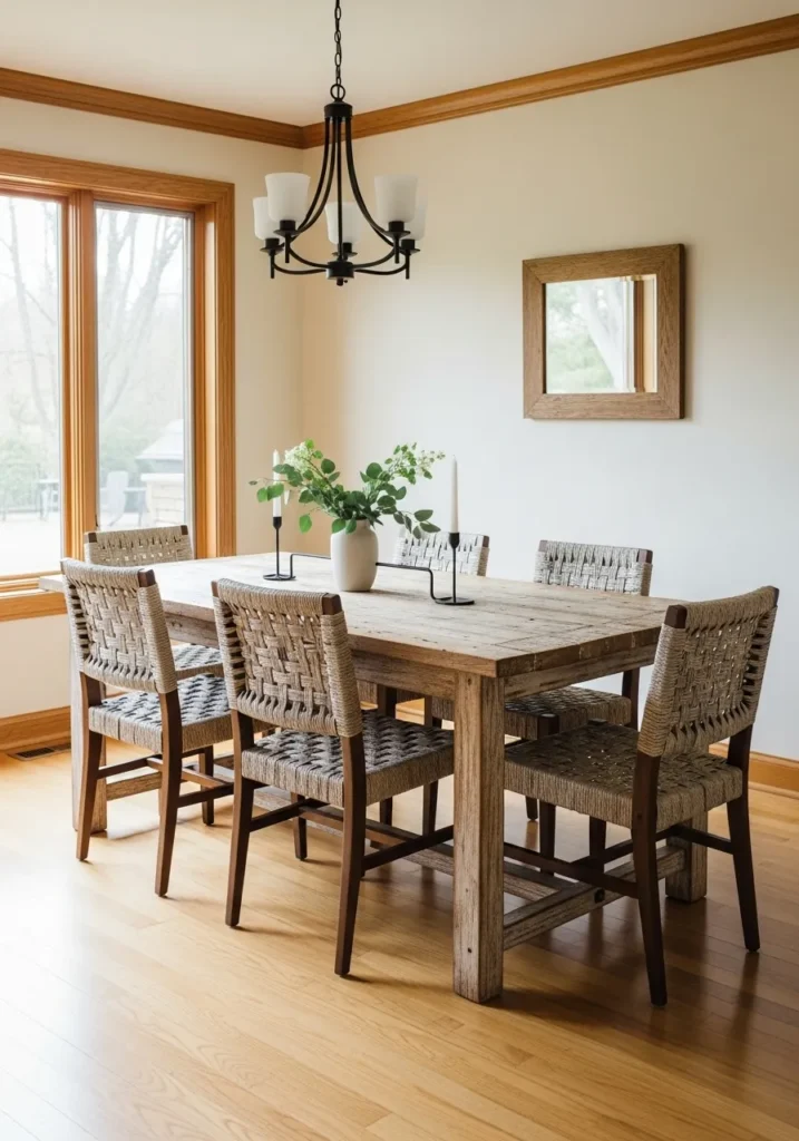 This dining room uses a calm greige wall color that balances beautifully with oak trim and woven dining chairs. The color feels modern but still warm enough to suit the wood. Simple styling keeps the focus on texture and tone. The space feels relaxed and intentional.