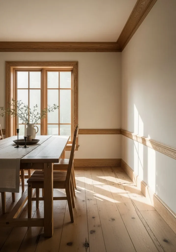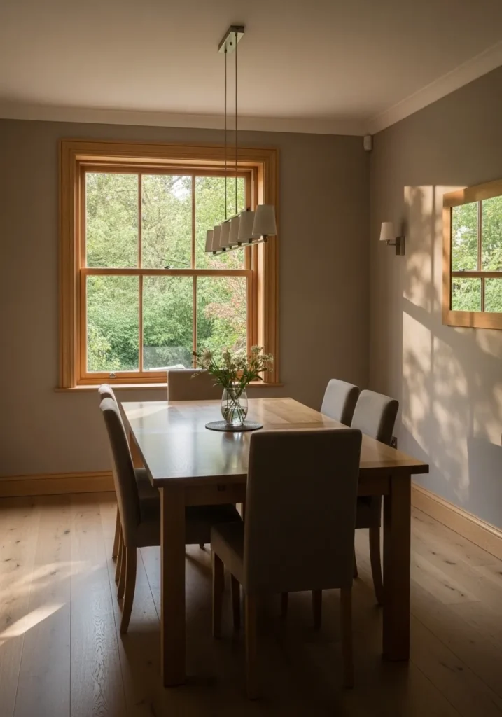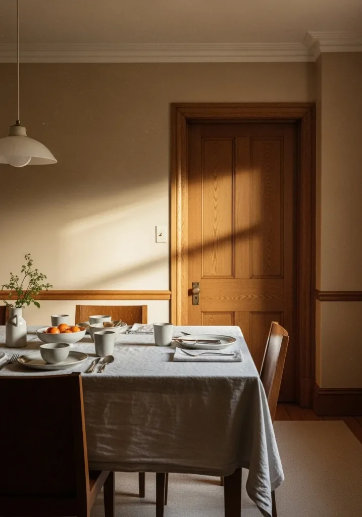 Here the walls are painted in a warm beige that blends effortlessly with oak trim and furniture. The color choice makes the space feel cozy and lived in while still looking polished. A simple table setting and soft lighting give the room an intimate feel. The oak door and trim add depth and character.