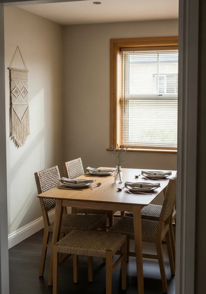 Calm Greige Dining Room With Woven Oak Seating