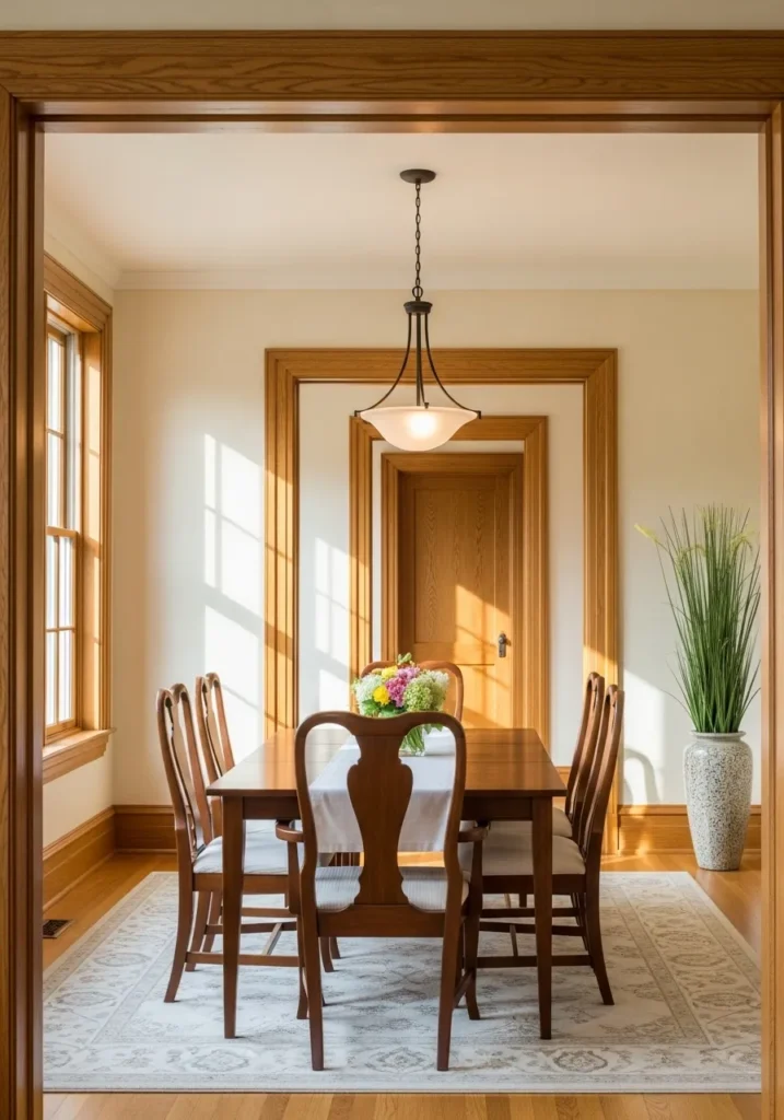 This dining room uses a soft cream wall color that reflects light beautifully and makes the oak trim feel even warmer. The trim around the windows and doorways creates a natural frame that gives the room structure without feeling heavy. Light wood floors and classic dining chairs keep the look timeless and calm. Everything feels open and welcoming.