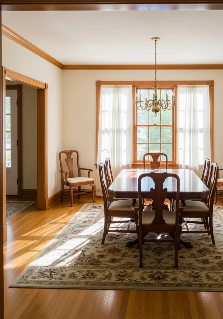This dining room leans light and airy with neutral walls that let the oak window frames stand out. Natural light fills the room and highlights the wood grain in the trim and floors. Traditional furniture and a patterned rug add warmth without overwhelming the space. The overall look feels balanced and timeless.
