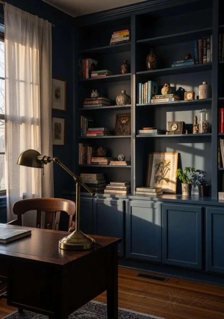 This home office wraps the walls in a deep navy blue that instantly sets a cozy, focused mood. Floor to ceiling built in shelves line the wall, painted in the same rich shade so everything feels seamless and intentional. The shelves are styled with books, framed art, and small decor pieces that pop softly against the dark backdrop. A warm wood desk sits in front, paired with a classic brass desk lamp that adds a soft glow. Natural light filters in from the side window, creating gentle contrast against the dramatic walls and highlighting the beautiful wood flooring below.