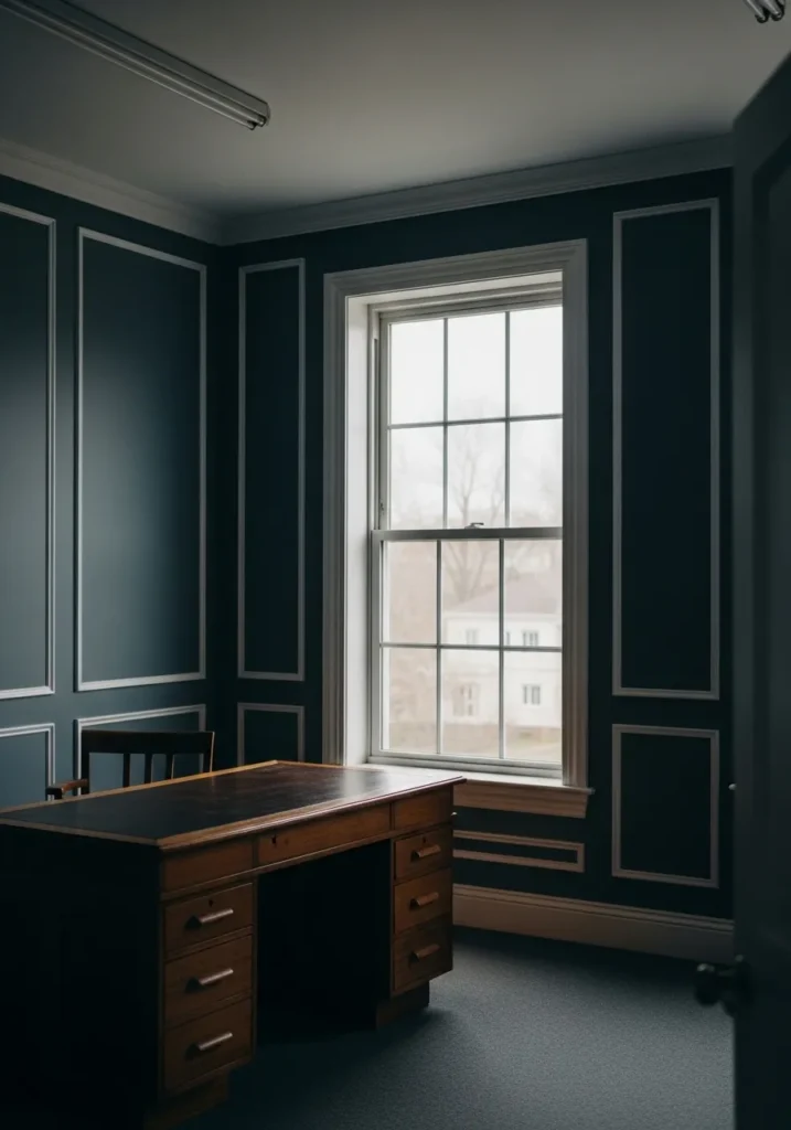 This office uses a deep teal shade across paneled walls, highlighting the architectural details and trim. The color settles into the molding and creates soft shadows that enhance the structure of the room. A traditional wooden desk sits in front of a large window, where daylight brightens the edges of the dark paint. The overall effect feels refined and thoughtfully layered.