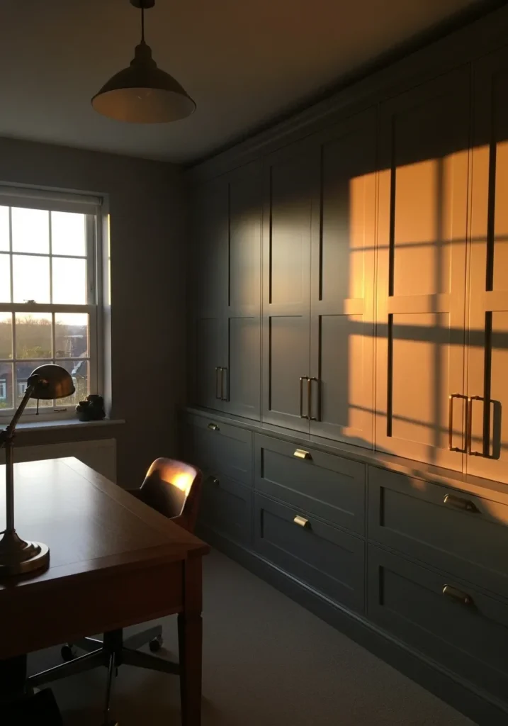 This home office is painted in a smoky blue gray that shifts beautifully depending on the light. Built in cabinets and drawers along one wall are coated in the same moody shade, creating a cohesive and polished look. Warm light from the window casts a golden reflection across the cabinet fronts, adding contrast to the cooler tones. A simple desk and pendant light complete the understated design.