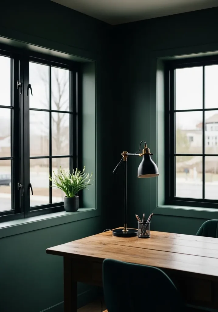 This home office is painted in a rich emerald green that wraps around the walls and pairs beautifully with bold black window trim. The dark color frames the natural light coming through the large windows, making the greenery outside feel even more vibrant. A simple wooden desk sits tucked into the corner, topped with a brass task lamp and a small plant for a fresh touch. The clean lines and minimal styling let the dramatic paint color truly shine.