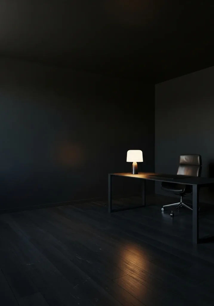 This office embraces an almost black paint color that makes the room feel bold and ultra modern. The walls and floor blend together in deep tones, creating a seamless and slightly dramatic atmosphere. A sleek desk and chair sit off to one side, while a single table lamp casts a warm pool of light against the dark backdrop. The minimal design makes every detail feel intentional.