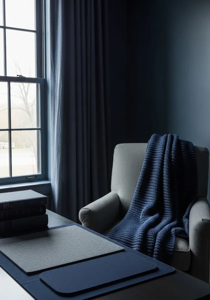 This office pairs deep charcoal blue walls with tall windows dressed in flowing gray curtains. The dark paint adds weight and drama, while the soft textiles bring in comfort. A plush armchair sits beside a simple desk, with neatly stacked books and a folded throw adding subtle layers. The natural light filtering through the curtains keeps the room from feeling too heavy.