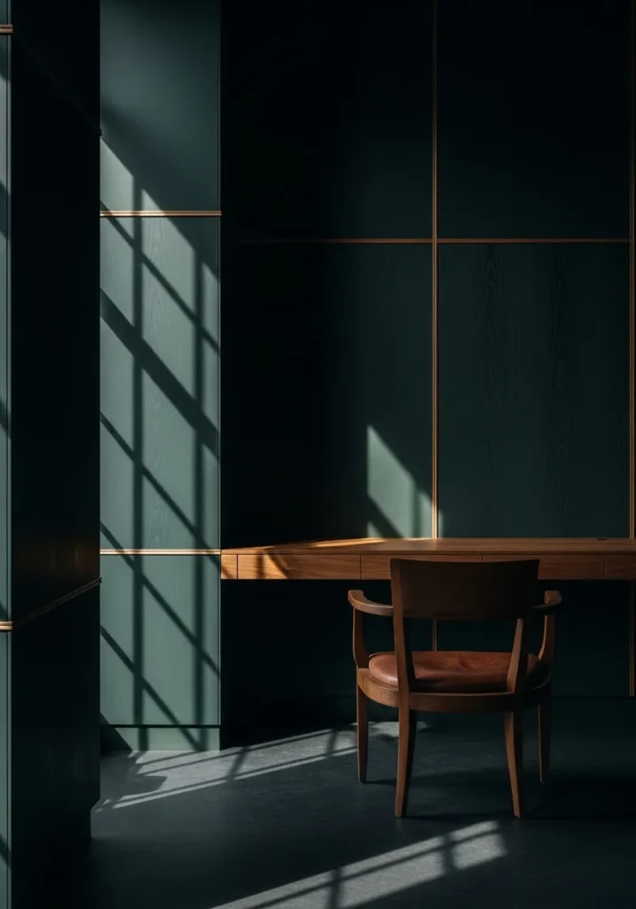This striking office features a deep green wall detailed with subtle grid paneling that adds structure and dimension. Sunlight streams through the window, casting dramatic shadows across the wall and wooden desk. The simple wooden chair and clean styling keep the focus on the architectural detail and rich paint color. The overall effect feels artistic yet grounded.