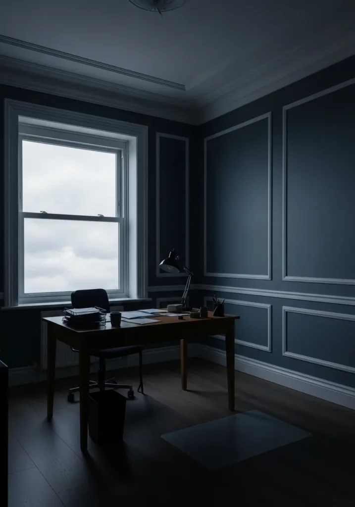 This home office showcases a deep blue gray paint that highlights the elegant wall paneling and trim. The color settles into the molding, creating soft shadows that enhance the architectural details. A classic desk sits beneath a bright window, allowing natural light to contrast beautifully with the moody walls. The design feels structured and thoughtfully styled.