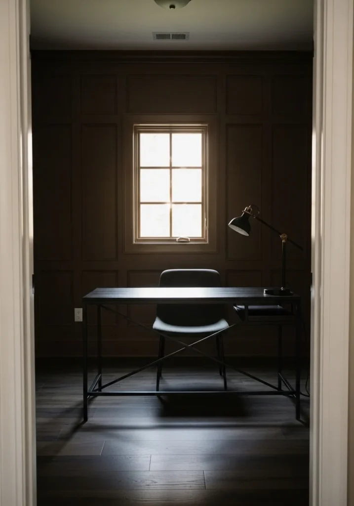 This office is wrapped in a deep chocolate brown that makes the entire room feel intimate and cocoon like. The walls, trim, and paneling are all soaked in the same dark tone, creating a seamless and dramatic envelope. A simple desk sits centered beneath a small window, where soft daylight spills in and casts gentle shadows across the floor. The minimal styling keeps the focus on the paint color itself, allowing the rich brown to fully shine.