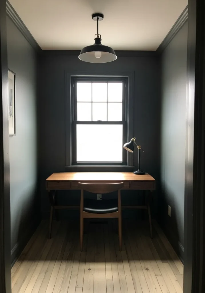 This tiny office nook is wrapped in a deep moody blue that instantly makes the slim space feel intentional and cozy. The dark paint climbs up the walls and frames the single window beautifully, creating a bold contrast against the bright natural light. A simple mid tone wooden desk stretches wall to wall, paired with a matching wooden chair that keeps the look clean and uncluttered. A black metal pendant light hangs overhead, while a small brass desk lamp adds a soft glow and a touch of warmth. The light wood floors balance out the darker walls, preventing the space from feeling closed in.