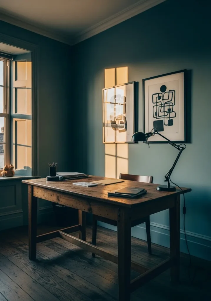 This home office features deep teal walls that add color while still keeping that cozy, dramatic vibe. The paint wraps around the room and frames the tall windows beautifully. A simple wooden desk sits near the window, topped with a task lamp and a few framed prints on the wall above. The natural wood tones and soft daylight balance out the richness of the teal, making the space feel calm yet inspiring.