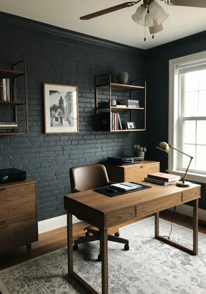 This office is painted in a deep charcoal gray that adds drama without going fully black. The textured wall behind the desk gives subtle dimension, while light wood furniture keeps the room feeling fresh. Open shelving and a few framed prints add personality without clutter. Daylight from the side window softens the dark paint and brings balance to the space.