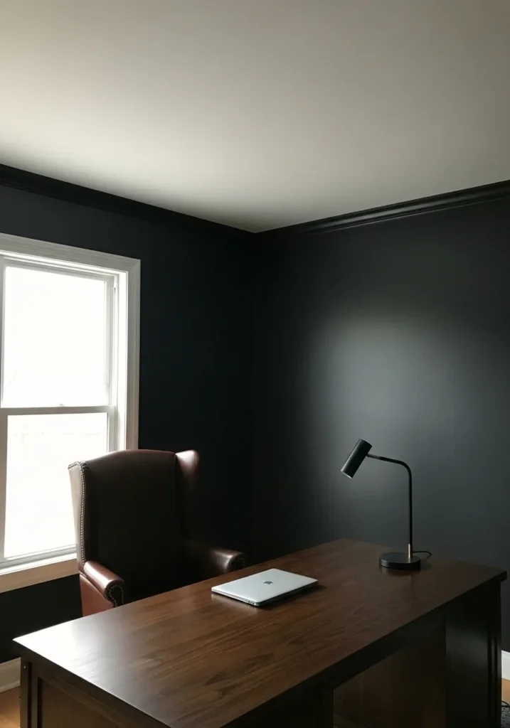 This home office leans into a deep inky blue that almost reads black in certain light. The walls are smooth and uninterrupted, allowing the color to fully surround the space. A simple wooden desk sits near a bright window, paired with a sleek black task lamp and a rich leather chair. The contrast between the dark walls and the crisp white window trim makes the room feel sharp and modern while still cozy.