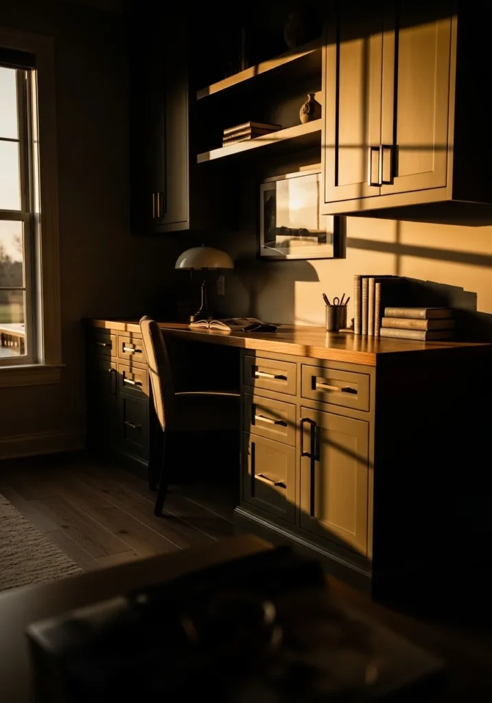 This office is wrapped in a deep espresso brown that gives the entire room a snug and grounded feel. Matching cabinetry lines the wall, complete with shelves and lower storage that blend right into the paint color. Warm light from the window and under cabinet areas reflects softly off the wood tones, creating a golden glow against the dark backdrop. The layered lighting makes the space feel inviting rather than heavy.