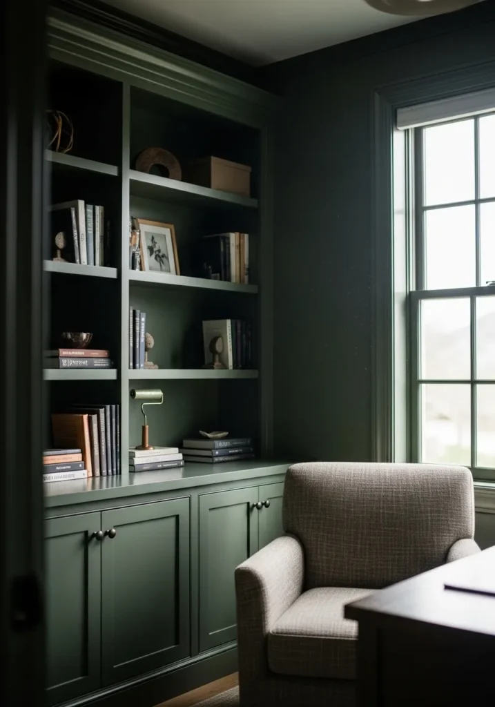 This office embraces a deep forest green that feels lush and sophisticated. Built in shelves painted in the same shade frame the window and hold books and decorative pieces in a curated way. A cozy upholstered chair sits nearby, softening the darker tones and adding a welcoming touch. Natural light streams in and highlights the subtle richness of the green.
