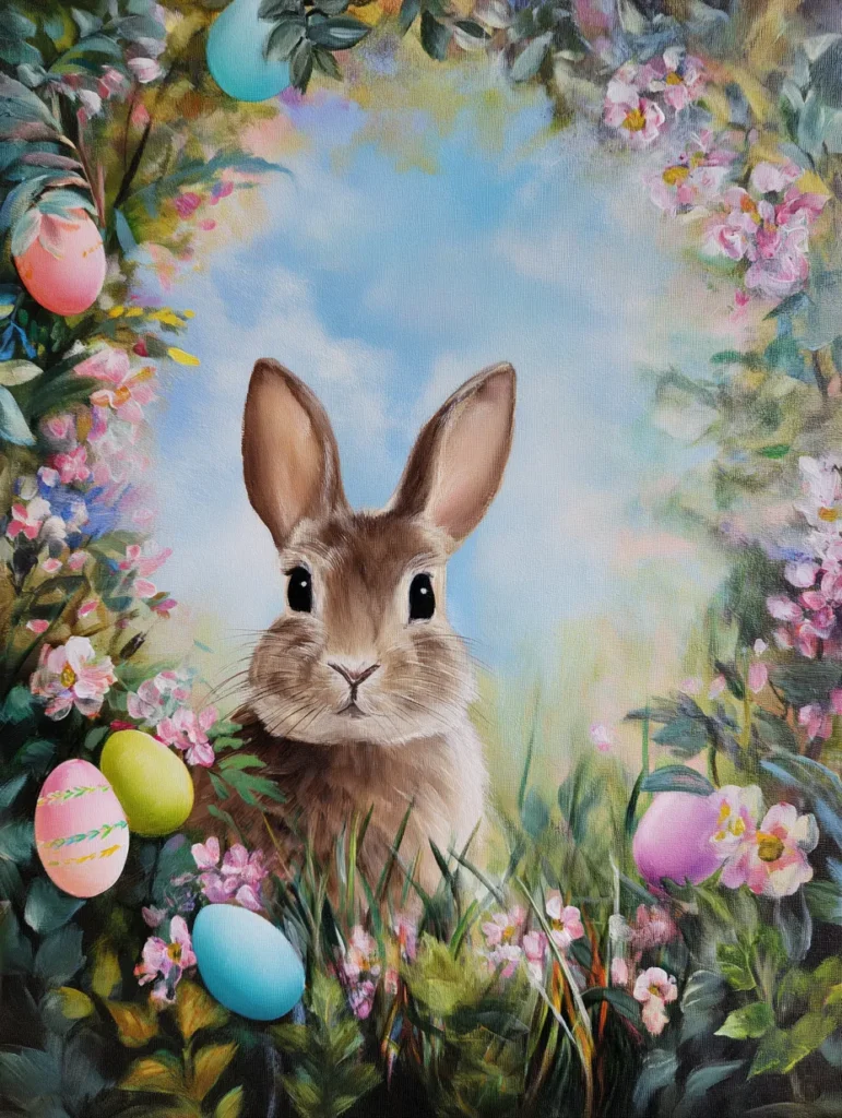 This adorable portrait showcases a soft brown rabbit with big dark eyes peeking out from a lush meadow. A natural arch of pink blossoms and green leaves frames the bunny, with colorful Easter eggs in sky blue, lime, and rose tucked into the foliage. The artist used wispy, light brush strokes to give the fur a velvety texture, while the background is a dreamy wash of pale blue and white clouds. The layout feels perfectly balanced, pulling your focus right to the rabbit’s cute face while the surrounding flowers add a festive, spring-like border.