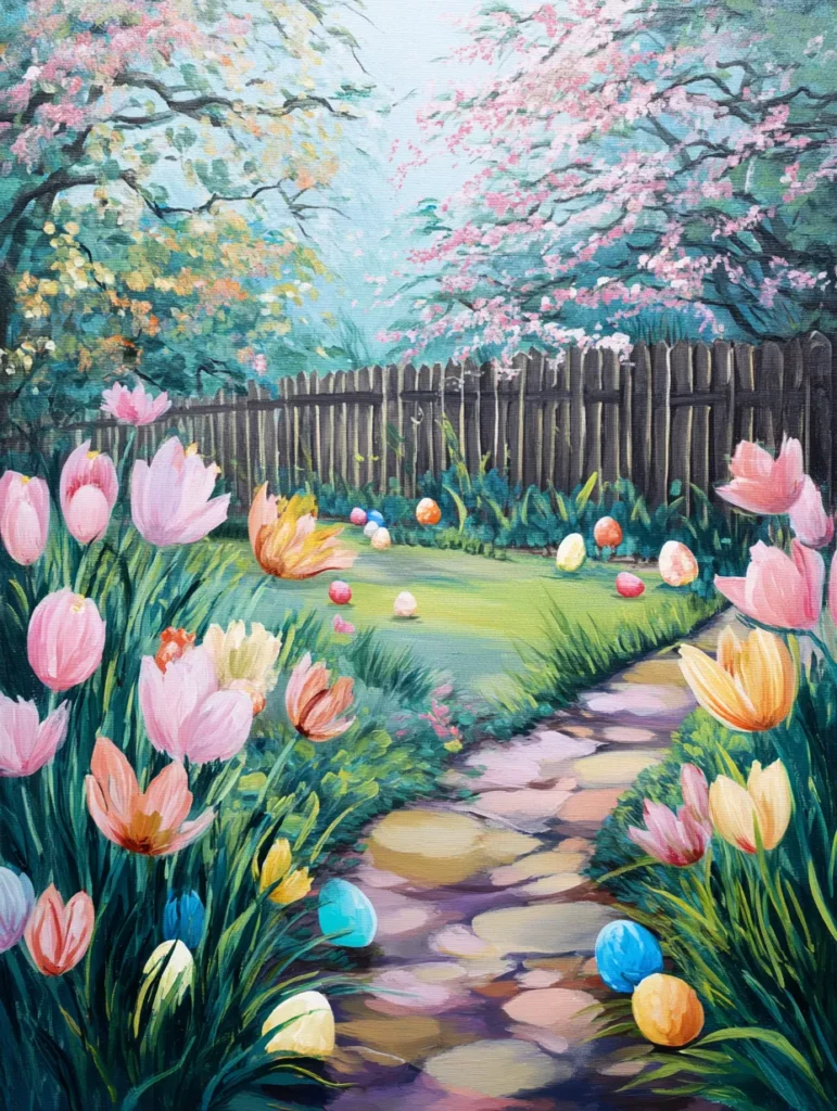 This charming scene highlights a winding stone path leading into a backyard garden filled with blooming tulips in shades of coral, peach, and cream. Small, colorful Easter eggs are scattered along the walkway and nestled in the vibrant green grass, while a dark wooden fence creates a rustic boundary in the background. The upper portion of the canvas is filled with airy, pink cherry blossoms that frame the sky with a soft, hazy glow. The brushwork on the flowers is loose and gestural, contrasting with the more structured, rounded shapes of the stepping stones.
