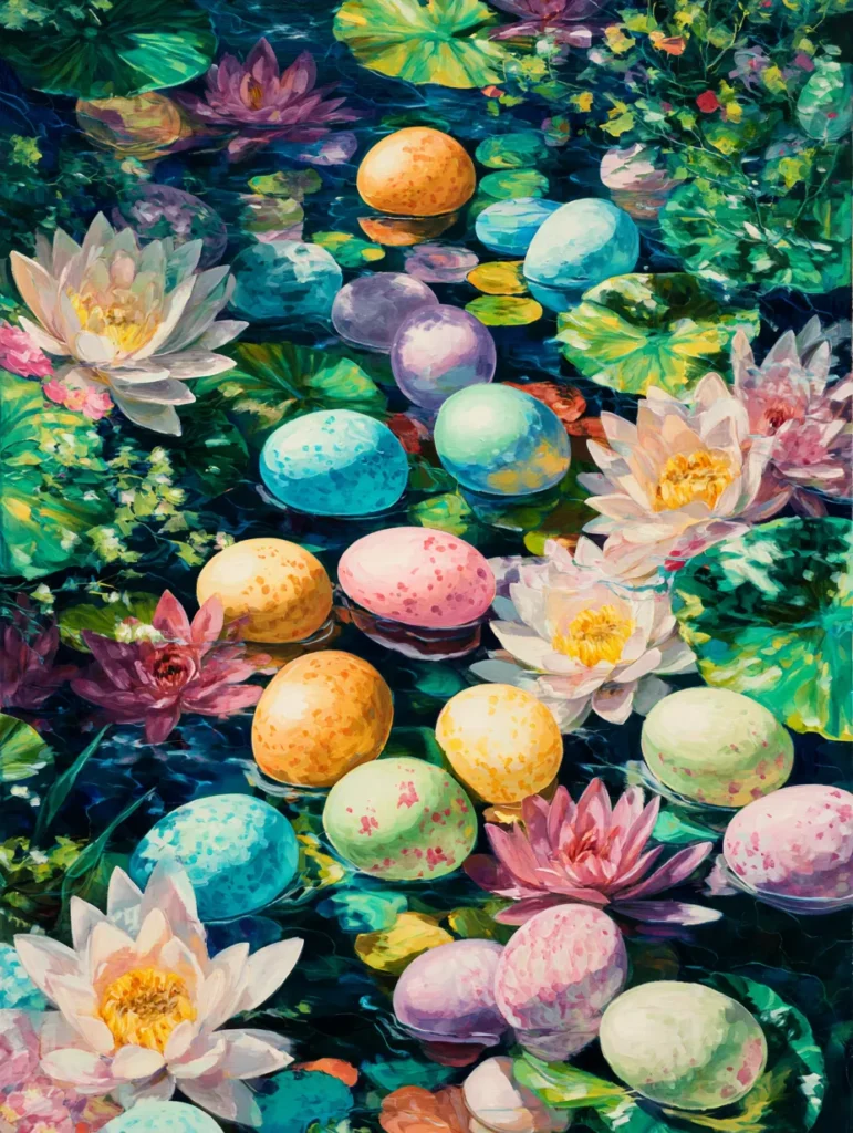 This unique composition has a cluster of speckled Easter eggs in soft citrus and berry tones floating peacefully among elegant water lilies. The dark, rippling water provides a deep contrast for the creamy white and magenta petals, while large green lily pads anchor the design. Short, choppy brush strokes create the illusion of movement on the water surface, making the scene feel alive and fluid. The layout is dense and full of life, with the bright eggs acting as playful focal points scattered across the lily-laden pond.