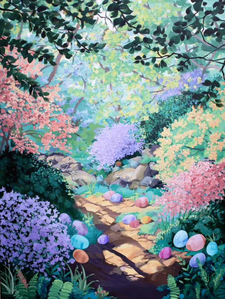 This lovely design includes a sun-dappled stone walkway winding through a lush garden overflowing with colorful bushes in shades of lilac, peach, and lemon yellow. Dozens of pastel Easter eggs in soft blues and pinks are scattered along the path and tucked into the dark green ferns at the edges. The artist used short, layered dabs of paint to create the frothy texture of the blooming shrubs, while long, sweeping strokes define the shadows stretching across the warm stones. The high-angle composition makes the garden feel vast and full of hidden surprises, perfectly capturing a bright spring morning.