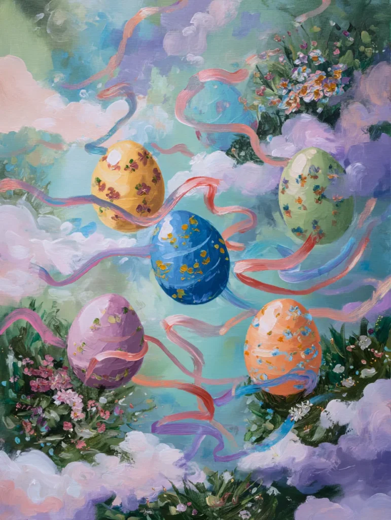 This ethereal painting features five beautifully decorated Easter eggs in shades of marigold, sage, sapphire, lavender, and apricot floating among fluffy pastel clouds. Pink and lilac ribbons dance between the eggs, creating a sense of graceful movement across the light blue sky. Small clusters of wildflowers peek through the cloud logic, while broad and airy brush strokes give the entire composition a dreamy, weightless quality. The layout is balanced yet dynamic, making the eggs appear as if they are part of a magical celestial celebration.