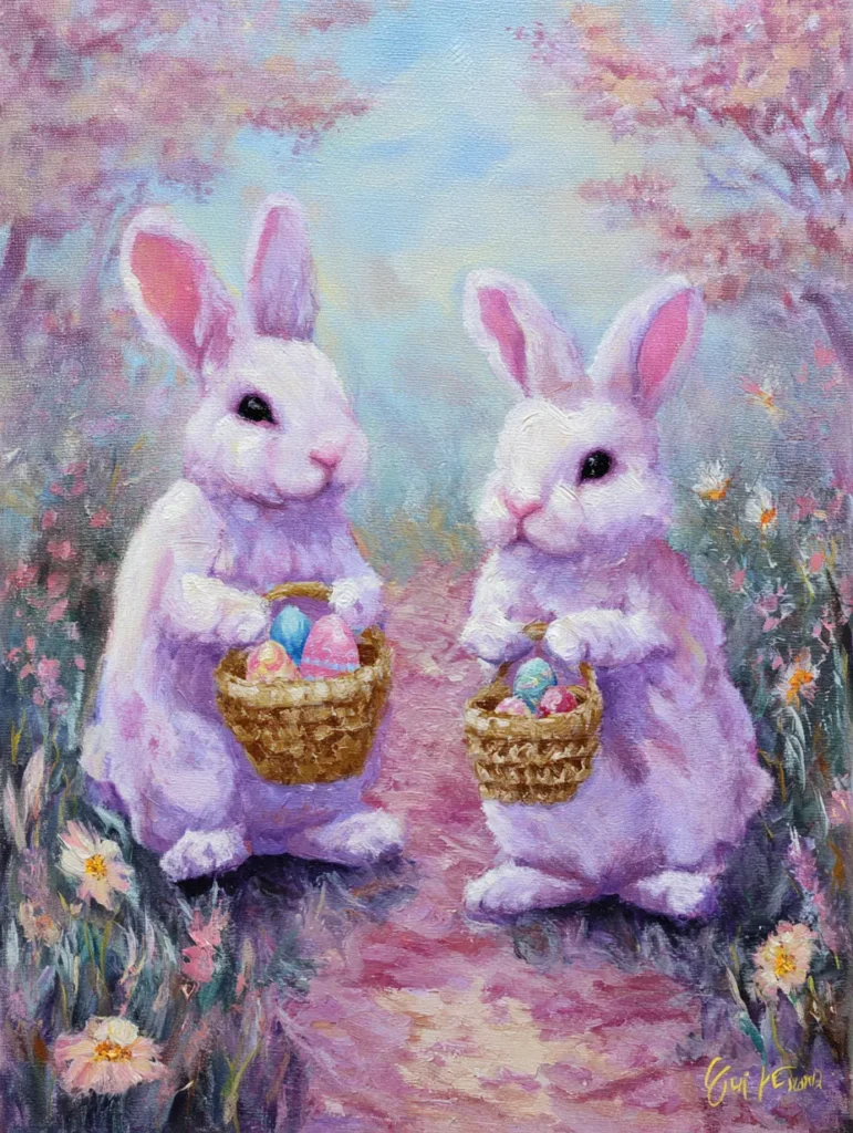 This charming scene showcases two fluffy white bunnies standing on a rosy garden path while holding small wicker baskets filled with colorful eggs. The palette is a dreamy mix of lavender, baby pink, and soft sky blue applied with thick, textured brushwork that gives the fur and flowers a tactile quality. Lush pink trees frame the top of the canvas, creating a cozy tunnel effect that draws your eye right to the center. Delicate wild flowers peek out from the grassy edges with quick dabs of yellow and white paint, adding a cheerful touch to the misty background.