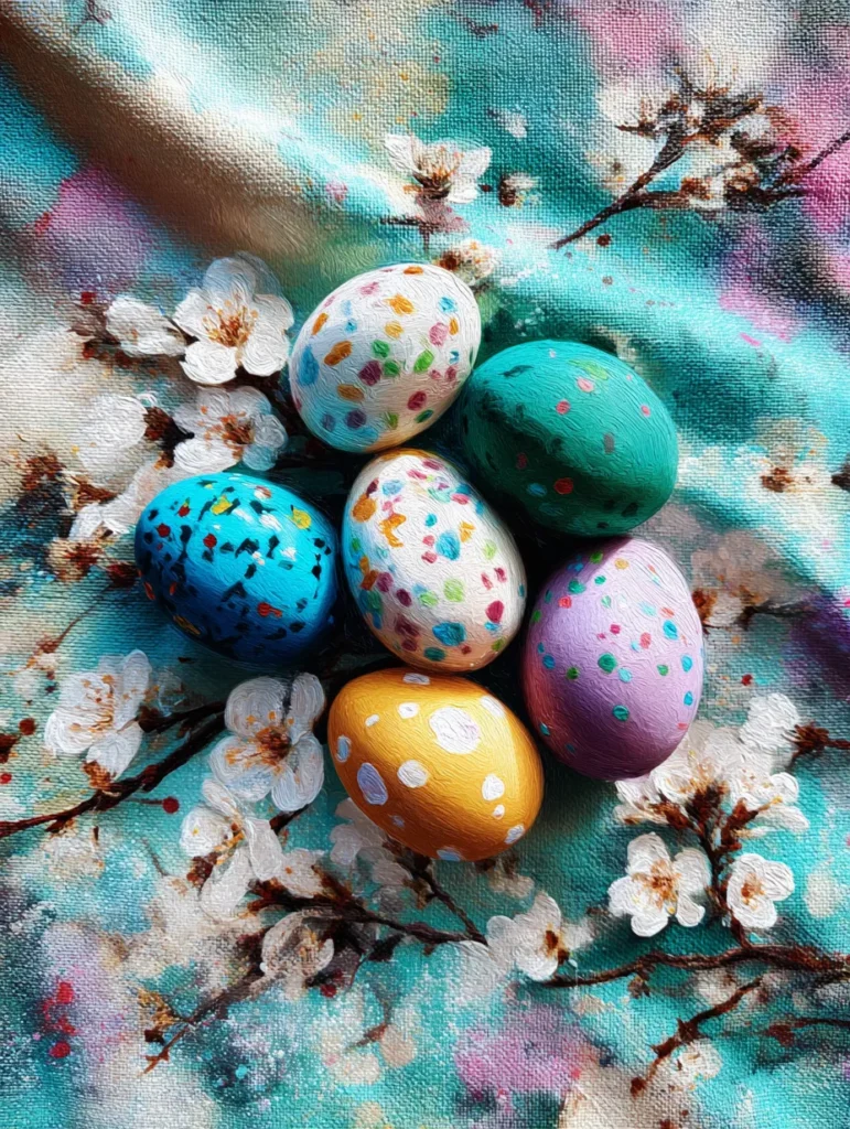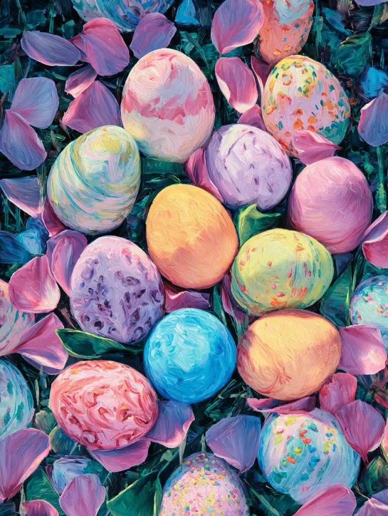 This design showcases a lush pile of Easter eggs hidden among soft pink petals and deep green leaves. The artist used a beautiful impasto style with thick and visible brush strokes that give the eggs a wonderful sense of weight and texture. Each egg is unique, featuring marbled swirls of peach, sky blue, and speckled patterns that look like confetti. The tight composition and rich lighting create a cozy and intimate spring scene that feels like a treasure hunt in a secret garden.