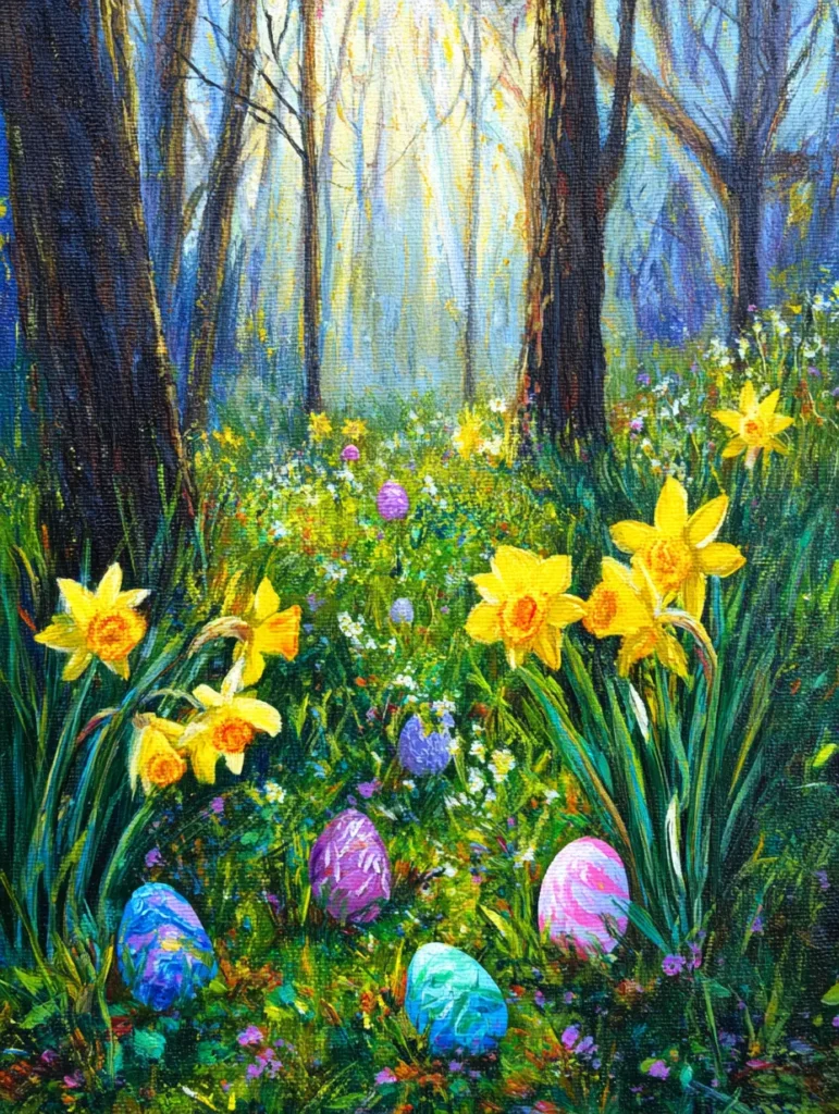 This dreamy landscape transports you right into a sun-drenched forest where the ground is carpeted with lush green grass and bright yellow daffodils. Several Easter eggs in jewel tones like sapphire blue, amethyst purple, and rosy pink are tucked away among the wildflowers, creating a playful scavenger hunt vibe. The tall, dark tree trunks provide a wonderful vertical contrast to the soft, hazy light filtering through the background trees. Short and dabbing brushstrokes give the flowers and grass a lovely textured feel that makes the whole scene pop with life and energy.