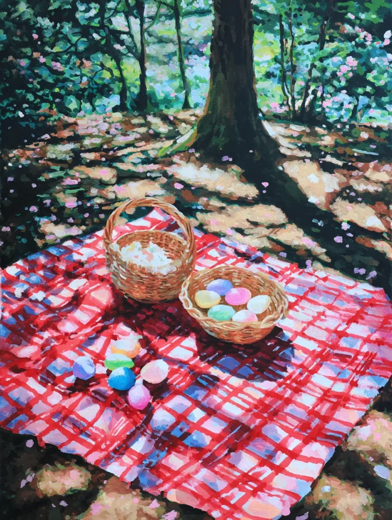 This painting highlights a bright red and white checkered blanket spread across a forest floor covered in pink petals. Short and chunky brush strokes create a beautiful effect of sunlight filtering through the canopy and hitting the ground in bright patches. Wicker baskets hold a variety of pastel eggs, while a few more are scattered on the fabric. The deep green trees and dark shadows in the background make the sunny picnic spot look especially vibrant and welcoming.